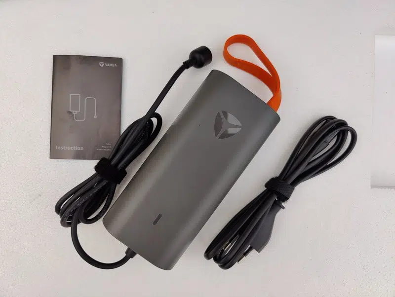 En plus du e-scooter, l'intérieur contient un ensemble d'accessoires, dont un guide d'utilisation, un outil multifonctions, un sachet avec des vis, ainsi qu'un chargeur de batterie. Vous remarquerez que ce chargeur est particulièrement esthétique et il bénéficie de la technologie GaN, très en vogue depuis quelques années. Il y a également une sacoche que l'on pourra venir fixer sur l'avant de la trottinette.