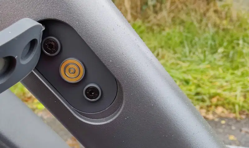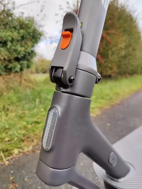 Enfin, au centre, nous avons l'écran digital et le seul et unique bouton multifonctions. L'écran est parfaitement intégré au cadre. Tout comme le crochet que l'on utilisera lorsque l'on aura besoin de plier la trottinette. Précisions au sujet de l'écran : il indique la vitesse actuelle, le mode de conduite, l'état du Bluetooth, l'état de l'éclairage, ainsi que l'autonomie restante. Par contre, aucune indication sur les kilomètres parcourus.