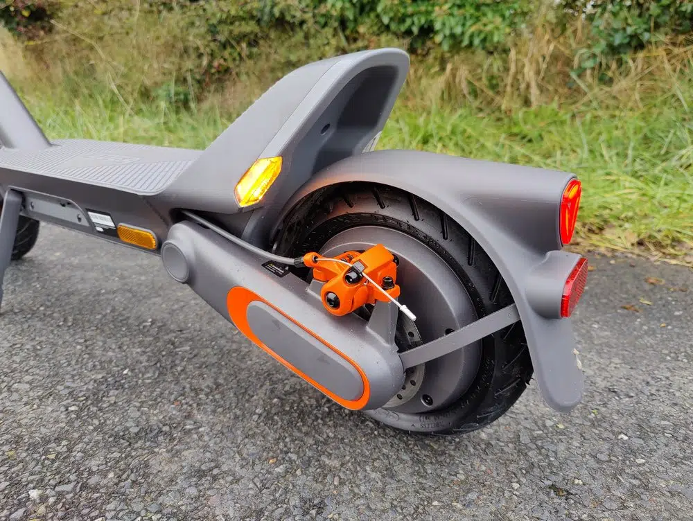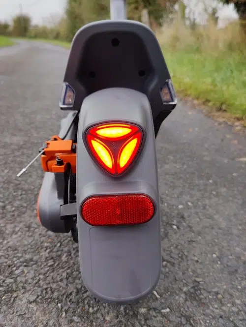 Cette trottinette est équipée d'une suspension à l'avant et d'une suspension à l'arrière, et il y a également des clignotants intégrés sur la partie arrière du cadre, que l'on peut activer à l'aide de deux boutons intégrés au guidon.