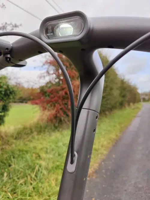 Le phare avant est intégré au guidon, si ce n'est qu'il dépasse légèrement. Yadea annonce une distance d'éclairage de 15 mètres et un angle de diffusion de la lumière de 120°. Esthétiquement, c'est l'élément qui m'a le moins convaincu. A contrario, le feu-stop arrière est une belle réussite : il reprend la forme du logo de Yadea. Les câbles reliés aux deux poignés de frein sont cachés directement dans le cadre, ce qui les rend très discrets.