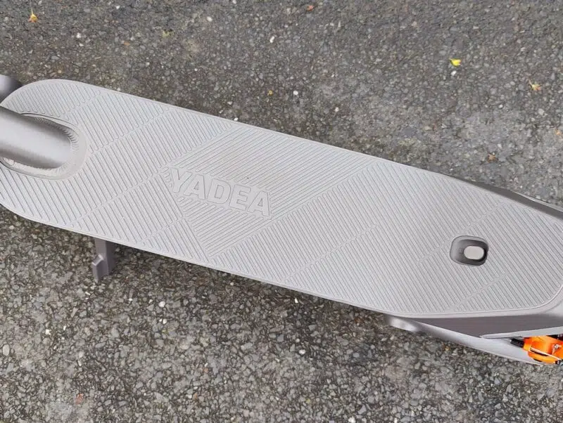 Le plateau sur lequel repose nos pieds lorsque l'on route est suffisamment grand pour ne pas être contraignant : 565 mm x 185 mm. Par ailleurs, il est important de préciser que Yadea affirme que ce modèle est adapté pour les personnes dont la taille est comprise entre 1,60m et 2,10m. En effet, le guidon est assez haut et il n'est pas réglable : c'est surement lié à la présence de la suspension à l'avant.