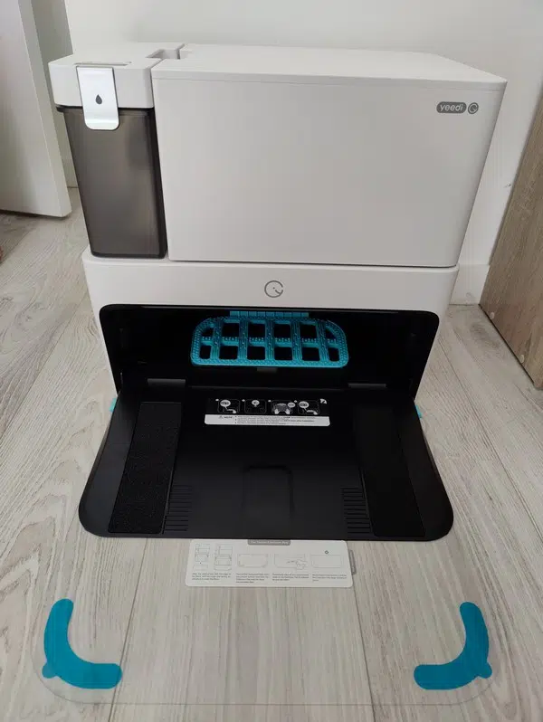 Le yeedi cube est conçu pour être un appareil tout-en-un capable d'aspirer et de laver le sol, sans que vous ayez à intervenir. Cela se traduit par une station d'accueil avec plusieurs fonctions et un robot avec un grand réservoir d'eau.