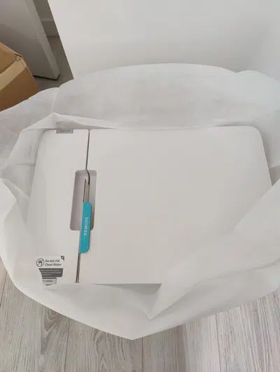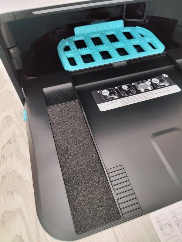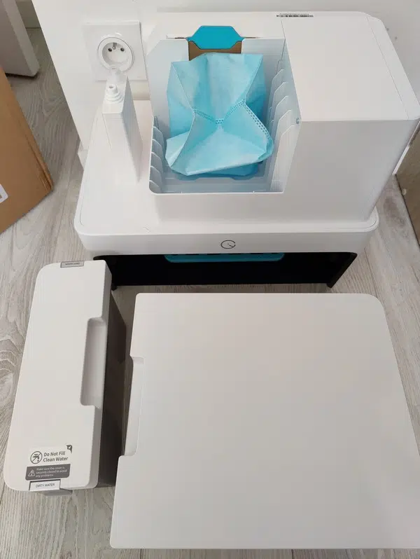 La station d'accueil rectangulaire est compacte par rapport à celles d'autres modèles. D'ailleurs, elle me fait penser à celle de certains modèles de robot de chez Roborock, voire même à certaines imprimantes multifonctions. Elle intègre un réservoir pour les eaux usées, ainsi qu'un sac à poussières dans lequel viendra se vider automatiquement le robot, en quelques secondes.