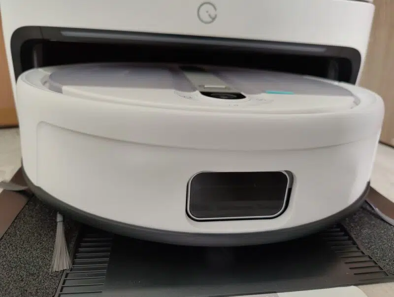 Lorsque le robot rentre à la base, la serpillière sera automatiquement lavée. De plus, la serpillière du robot sera automatiquement séchée à l'air chaud (40°C) à la fin du nettoyage dans le but d'éliminer les odeurs liées à l'humidité et certaines bactéries. La station est équipée de deux bandes avec du grip pour faciliter la progression du robot lorsqu'il doit venir se mettre en place dans la station.