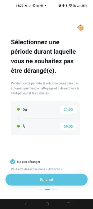 Je me permettrais seulement de compléter avec la présentation de l'assistant qui s'affiche à la fin de l'association avec l'application yeedi. Il vous permet de faire vos premiers pas dans la configuration et l'utilisation du robot, notamment en vous proposant de définir une plage horaire durant laquelle vous ne souhaitez pas être dérangé.