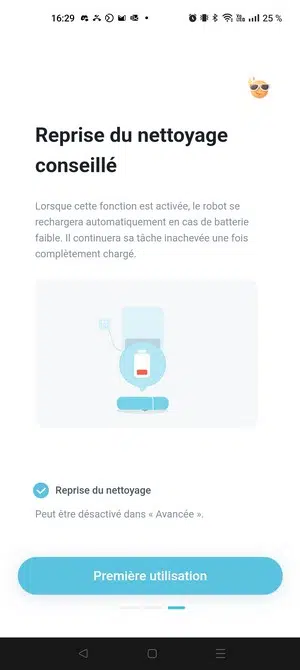 - Reprise du nettoyage, de telle sorte que si le robot n'a plus de batterie alors qu'il n'a pas terminé de nettoyer, il poursuivra une fois la batterie rechargée