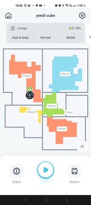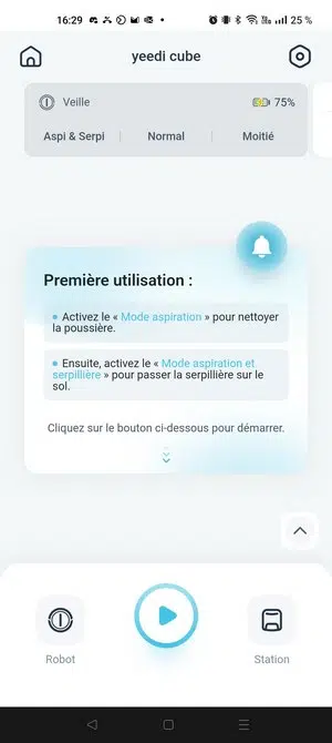 L'application yeedi, bien traduite en français, permet à la fois de contrôler le robot et de le configurer, en allant plus loin qu'avec les boutons physiques présents sur le dessus du robot. La page d'accueil donne un aperçu sur la carte de votre logement (générée suite au premier nettoyage), l'état de la batterie et la configuration actuelle. Un gros bouton "Play" permet de lancer le nettoyage.