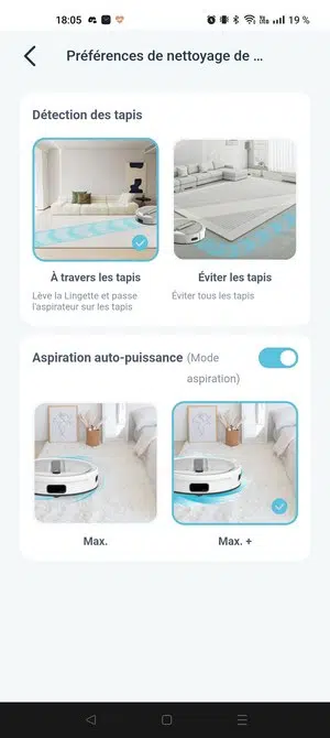 - Personnaliser le nettoyage pour chaque pièce : puissance d'aspiration et débit d'eau