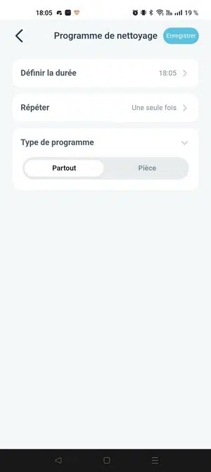 - Planification du nettoyage, à une heure spécifique, un ou plusieurs jours de la semaine, avec un nettoyage complet ou seulement par zone
