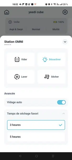 A cela s'ajoute une série d'options pour la station en elle-même, comme la gestion du vidage automatique, la configuration d'une durée pour sécher la serpillière (pas un planning, mais bien une durée, soit 3h, soit 5h), et la possibilité de déclencher une action manuellement (laver la serpillière, sécher la serpillière, ou vider le bac à poussières du robot).