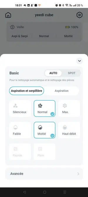 - Type de nettoyage : aspiration et serpillière ou aspiration seule, c'est à vous de choisir