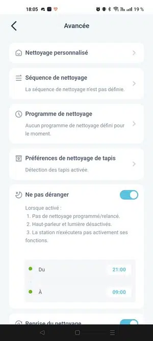 - Ne pas déranger pour empêcher le robot de nettoyer sur une plage horaire définie