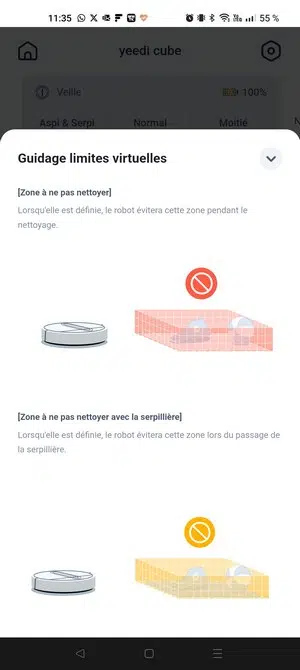 - Créer des limites virtuelles pour empêcher le robot de nettoyer certaines zones (aucun nettoyage ou aspiration seule)