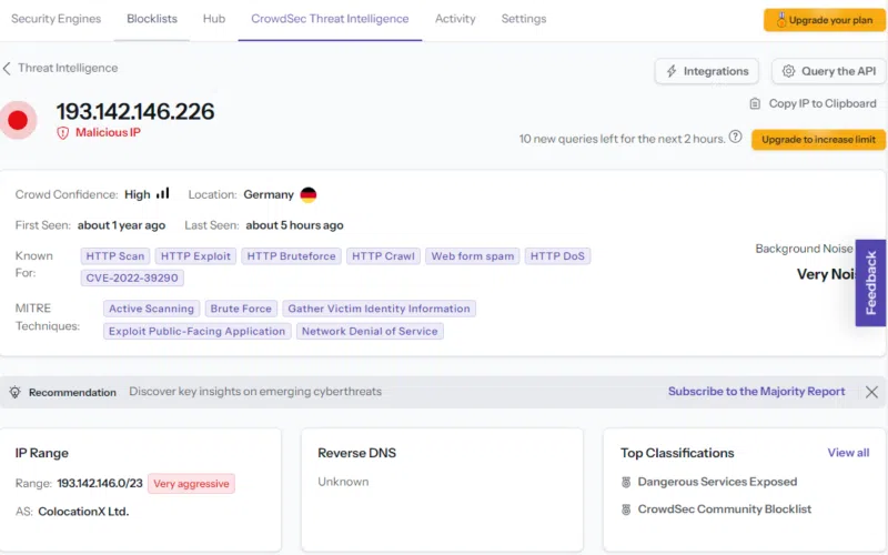 Sans parler des alertes et décisions de notre instance, nous pouvons solliciter la Threat Intelligence de CrowdSec pour obtenir des informations sur une adresse IP. Prenons l'exemple de l'adresse IP suivante : "193.142.146[.]226".