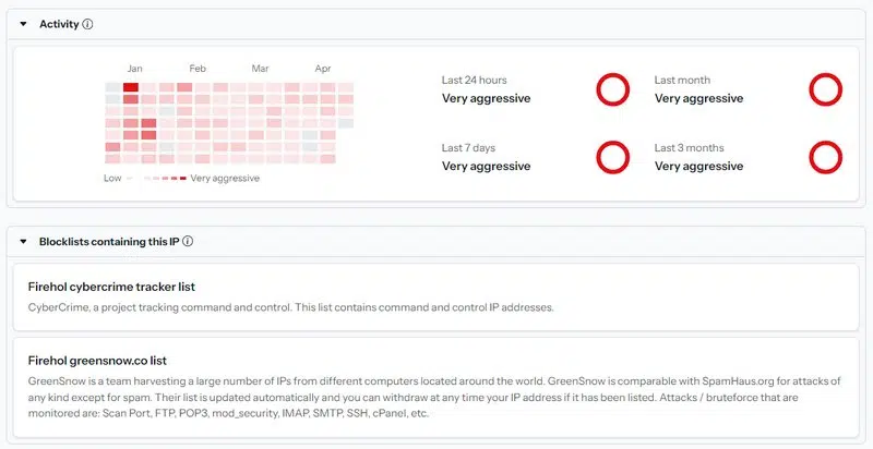 Nous pouvons constater que cette adresse IP est très active et agressive depuis plusieurs mois. De plus, nous pouvons constater qu'elle est déjà référencée dans la blocklist "Firehol cybercrime tracker list" à laquelle notre serveur est abonné ! C'est une bonne nouvelle, puisque cela veut dire que cette adresse IP est déjà bloquée sur notre serveur grâce au fait qu'il soit abonné à cette liste.