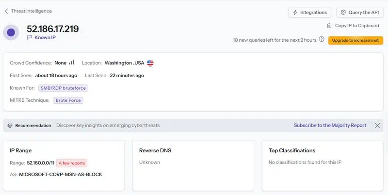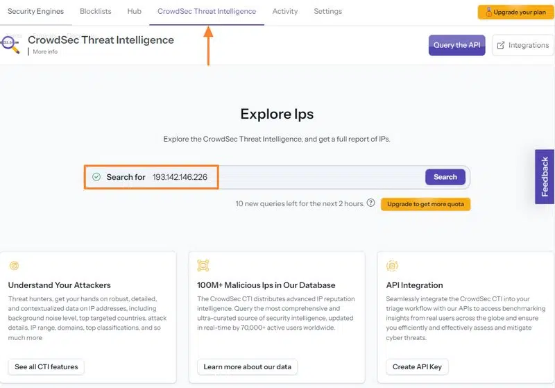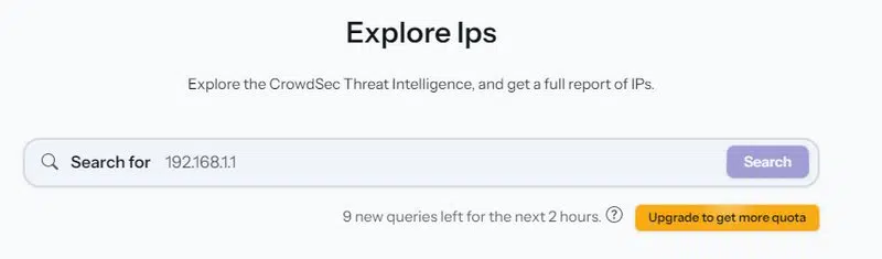 Sachez que même si vous ne déployez pas CrowdSec sur vos serveurs, vous pouvez tout de même créer un compte CrowdSec Console pour solliciter la "CrowdSec Threat Intelligence" afin d'obtenir des renseignements sur une adresse IP. Vous pouvez effectuer 10 requêtes par cycle de 2 heures.