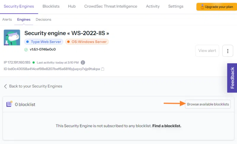 La prochaine étape va consister à nous abonner à une blocklist supplémentaire afin de bloquer des adresses IP malveillantes connues, avant même qu'elles aient une chance de s'en prendre à notre serveur. Après avoir cliqué sur l'instance, nous cliquer sur "Browse available blocklists" pour accéder à la liste des blocklists.
