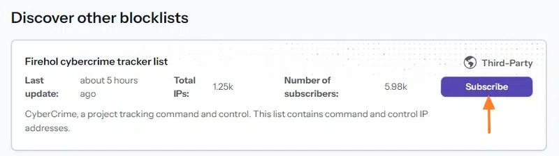 Nous allons cliquer sur le bouton "Subscribe" au niveau de la blocklist nommée "Firehol cybercrime tracker list". Elle contient des adresses IP malveillantes associées à des serveurs de Command and Control (C2) utilisés par des attaquants.