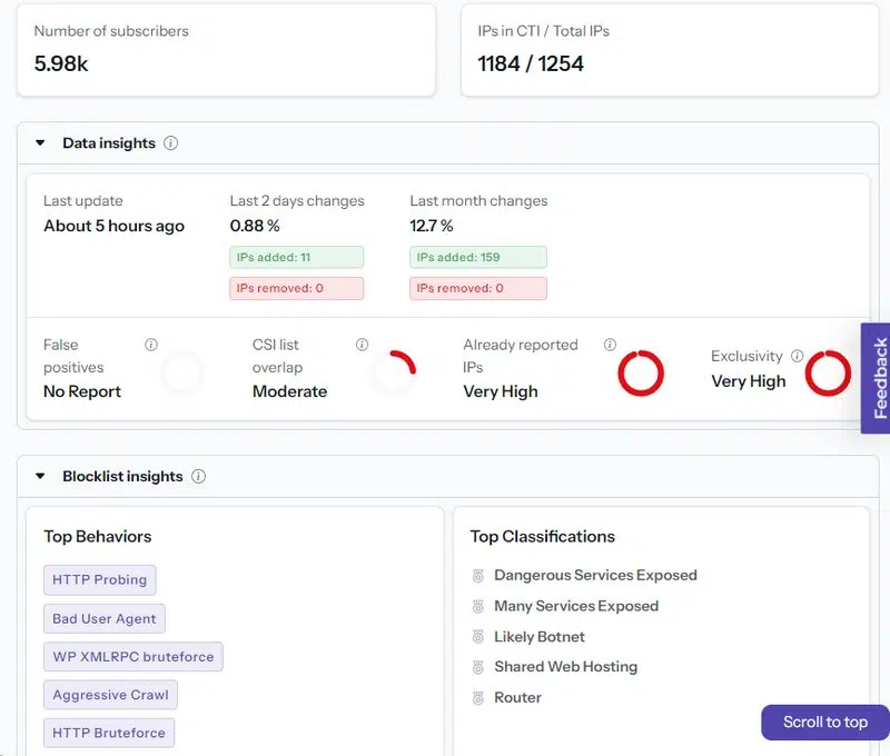 Ces indicateurs permettent d'évaluer la pertinence d'une blocklist vis-à-vis d'une autre et ajoutent de la transparence à la Console CrowdSec.