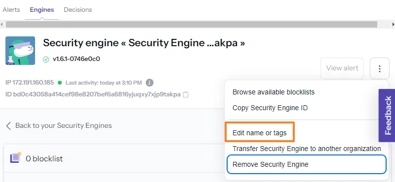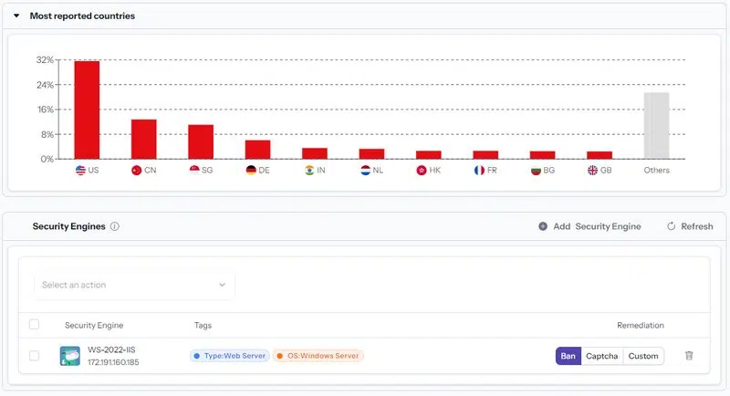 Tout en bas de la page, nous allons cliquer sur le bouton "Add Security Engine(s)" puis sélectionner notre instance. Nous devons également choisir un type d'action à appliquer à ces adresses IP : "Ban" permet de bannir les adresses IP de cette blocklist. Une fois que c'est fait, il ne reste plus qu'à valider.