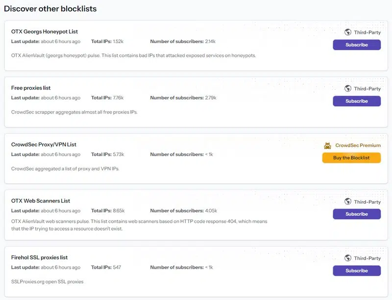 Quand vous installez CrowdSec, vos instances bénéficient des listes noires d'adresses IP détectées par la communauté CrowdSec. Ceci protège vos serveurs équipés de CrowdSec, mais bien que continuellement mises à jour, ces listes ne sont pas exhaustives. Aucune liste n'est exhaustive de toute façon, d'où l'intérêt de combiner plusieurs sources. C'est là que les blocklists tierces proposées par CrowdSec interviennent en complément de quelques blocklists estampillées "CrowdSec Premium" (réservées aux utilisateurs de la version Enterprise).