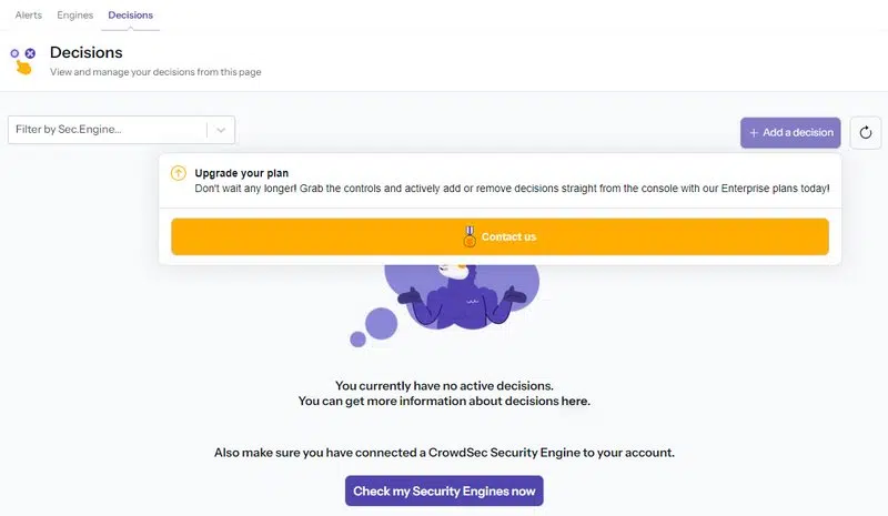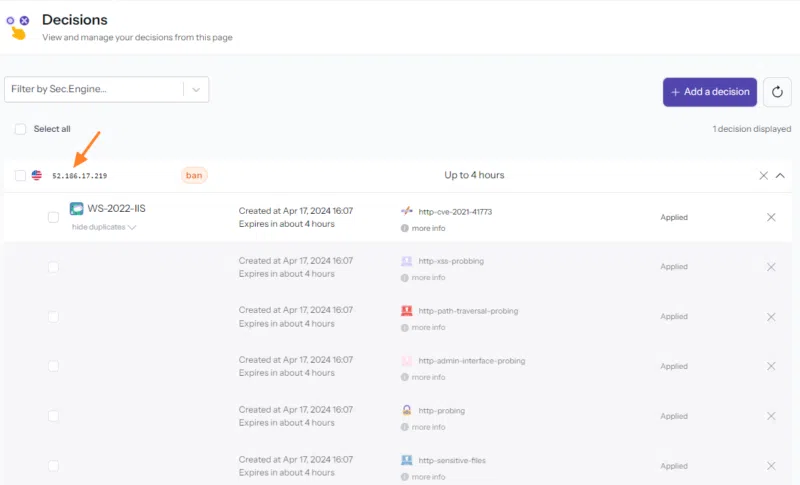 Autre avantage de cette version payante, c'est qu'elle vous permet de gérer les décisions de vos instances à partir de la console CrowdSec. Ainsi, vous pouvez ajouter une adresse IP à la console CrowdSec pour pousser vers vos instances afin qu'elle soit bloquée. À l'inverse, vous pouvez supprimer une décision (c'est-à-dire le ban sur une adresse IP, par exemple), à partir de la console CrowdSec.
