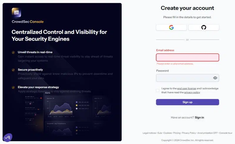 La première étape consiste à créer un compte CrowdSec Console : vous avez seulement besoin d'une adresse e-mail valide. Pour accéder directement à la page d'inscription, suivez ce lien :