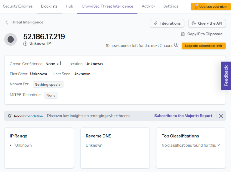Sachez que même si vous ne déployez pas CrowdSec sur vos serveurs, vous pouvez tout de même créer un compte CrowdSec Console pour solliciter la "CrowdSec Threat Intelligence" afin d'obtenir des renseignements sur une adresse IP. Vous pouvez effectuer 10 requêtes par cycle de 2 heures.