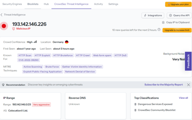Sans parler des alertes et décisions de notre instance, nous pouvons solliciter la Threat Intelligence de CrowdSec pour obtenir des informations sur une adresse IP. Prenons l'exemple de l'adresse IP suivante : "193.142.146[.]226".