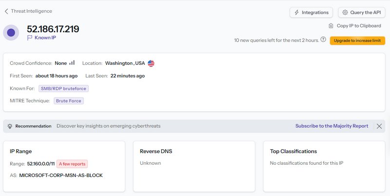 Dans l'exemple ci-dessous, nous pouvons constater que l'adresse IP "52.186.17.219" a été bannie par CrowdSec, car elle a effectué des actions suspectes sur le service Web de mon serveur, en plus d'un brute force sur le service RDP.