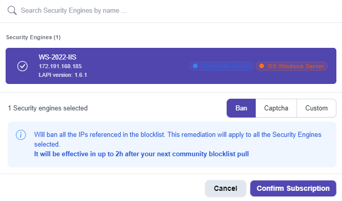 Tout en bas de la page, nous allons cliquer sur le bouton "Add Security Engine(s)" puis sélectionner notre instance. Nous devons également choisir un type d'action à appliquer à ces adresses IP : "Ban" permet de bannir les adresses IP de cette blocklist. Une fois que c'est fait, il ne reste plus qu'à valider.