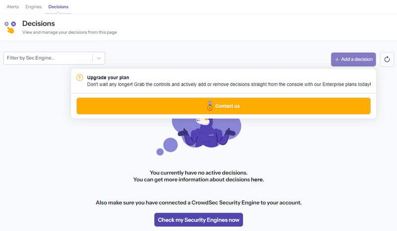 Autre avantage de cette version payante, c'est qu'elle vous permet de gérer les décisions de vos instances à partir de la console CrowdSec. Ainsi, vous pouvez ajouter une adresse IP à la console CrowdSec pour pousser vers vos instances afin qu'elle soit bloquée. À l'inverse, vous pouvez supprimer une décision (c'est-à-dire le ban sur une adresse IP, par exemple), à partir de la console CrowdSec.