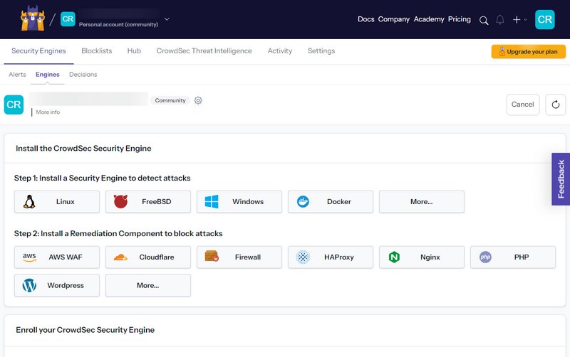 Pour enregistrer la nouvelle instance dans la console CrowdSec, nous devons exécuter la commande fournie sur l'interface de la console :