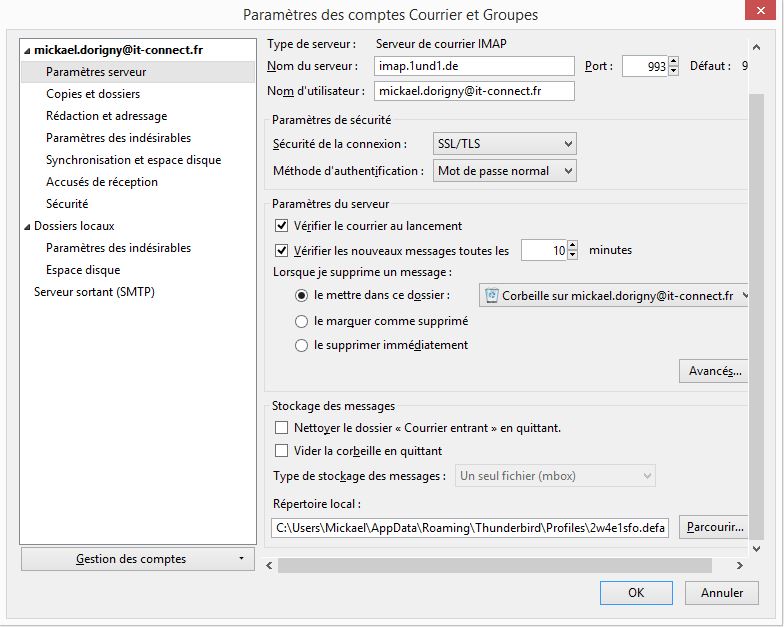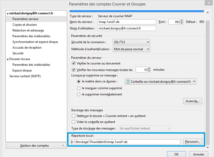 Ensuite, nous allons retourner dans "Outils" puis "Paramètres des comptes" puis sélectionner "Paramètres serveur" pour ensuite modifier le répertoire de stockage des mails via le bouton "Parcourir" , nous irons alors sélectionner le nouveau répertoire dans lequel nous venons de copier nos mails, dans le cas du tutoriel "D:\Stockage\Thunderbird\imap.1und1.de" :