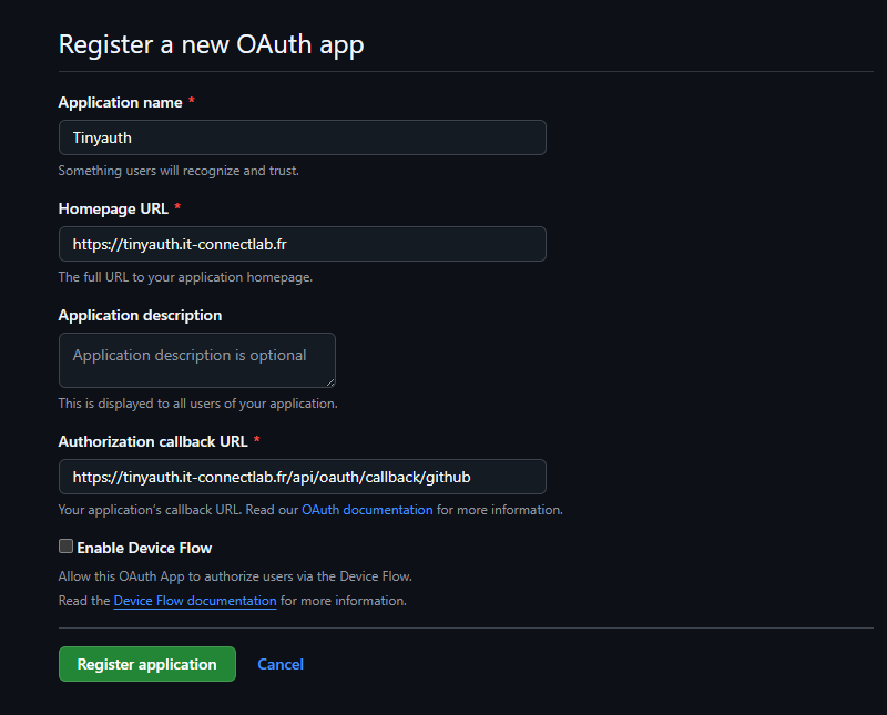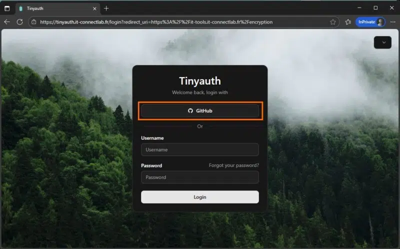 Pour finir, voici la configuration complète avec l'authentification GitHub et la personnalisation de l'interface Tinyauth :