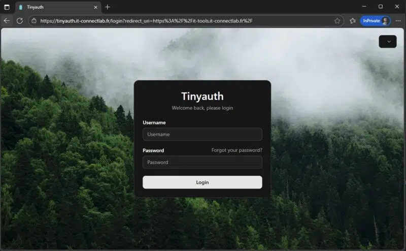 https://it-tools.it-connectlab.fr. - Traefik intercepte la requête et l’envoie d’abord à Tinyauth (ForwardAuth).