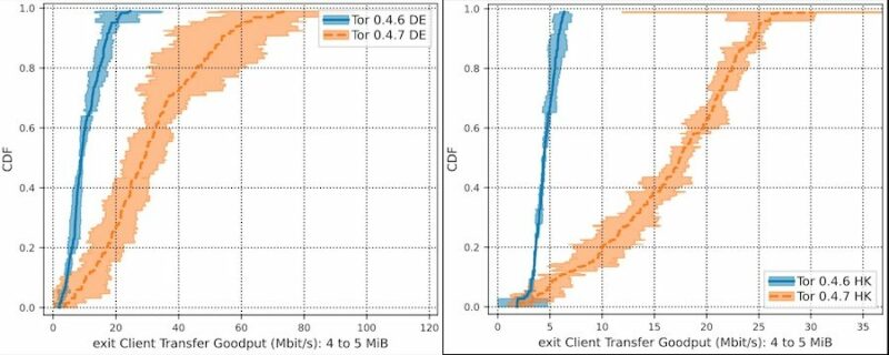 Les équipes de Tor ont effectué des tests de performance, afin de comparer les résultats entre les versions 0.4.6 et 0.4.7 de Tor. Voici un exemple avec un client basé à Hong-kong et un autre client basé en Allemagne, où l'on voit clairement la différence de débit.