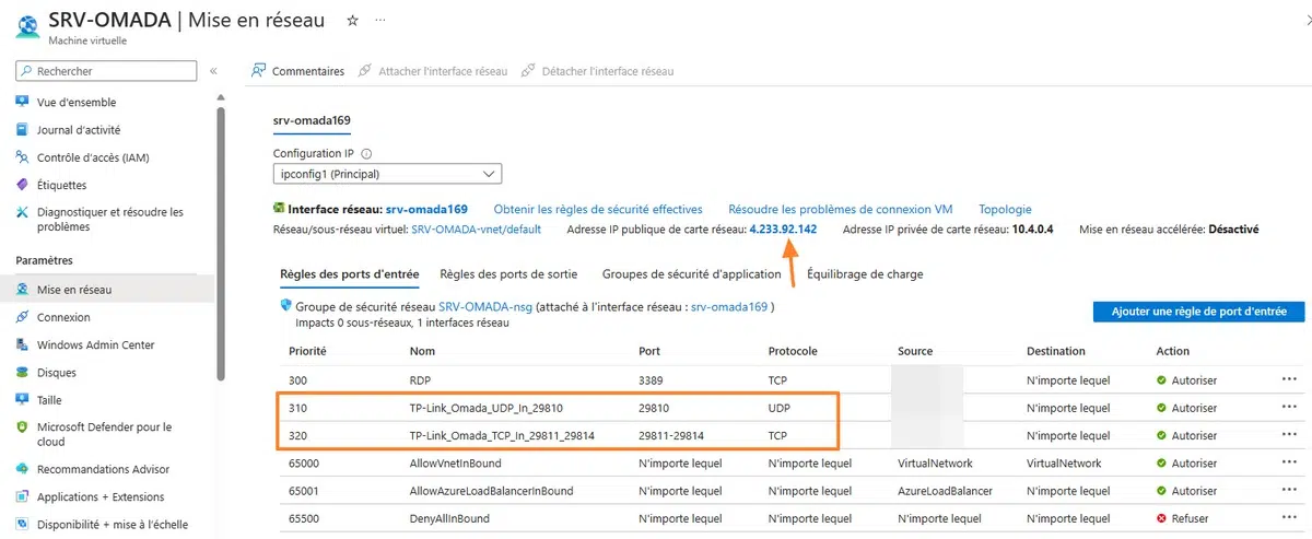 Pour restreindre l'accès à notre contrôleur, l'adresse IP publique du site où seront déployés les équipements réseau sera ajoutée aux deux règles. À chaque nouveau client à déployer, il suffira d'ajouter son adresse IP publique à la liste des adresses IP autorisées. Ceci est facultatif.