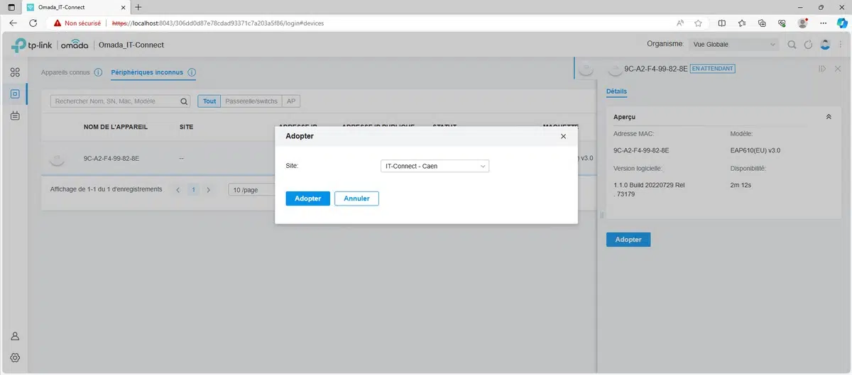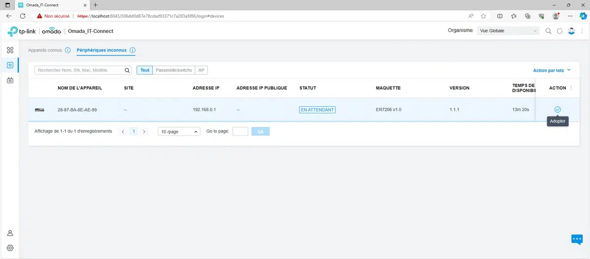 Quelques secondes plus tard, le routeur apparaît sur l'interface du contrôleur Omada : il est en attente d'adoption, ou d'enrollment si vous préférez. Nous allons l'adopter pour qu'il soit géré par notre contrôleur Omada.