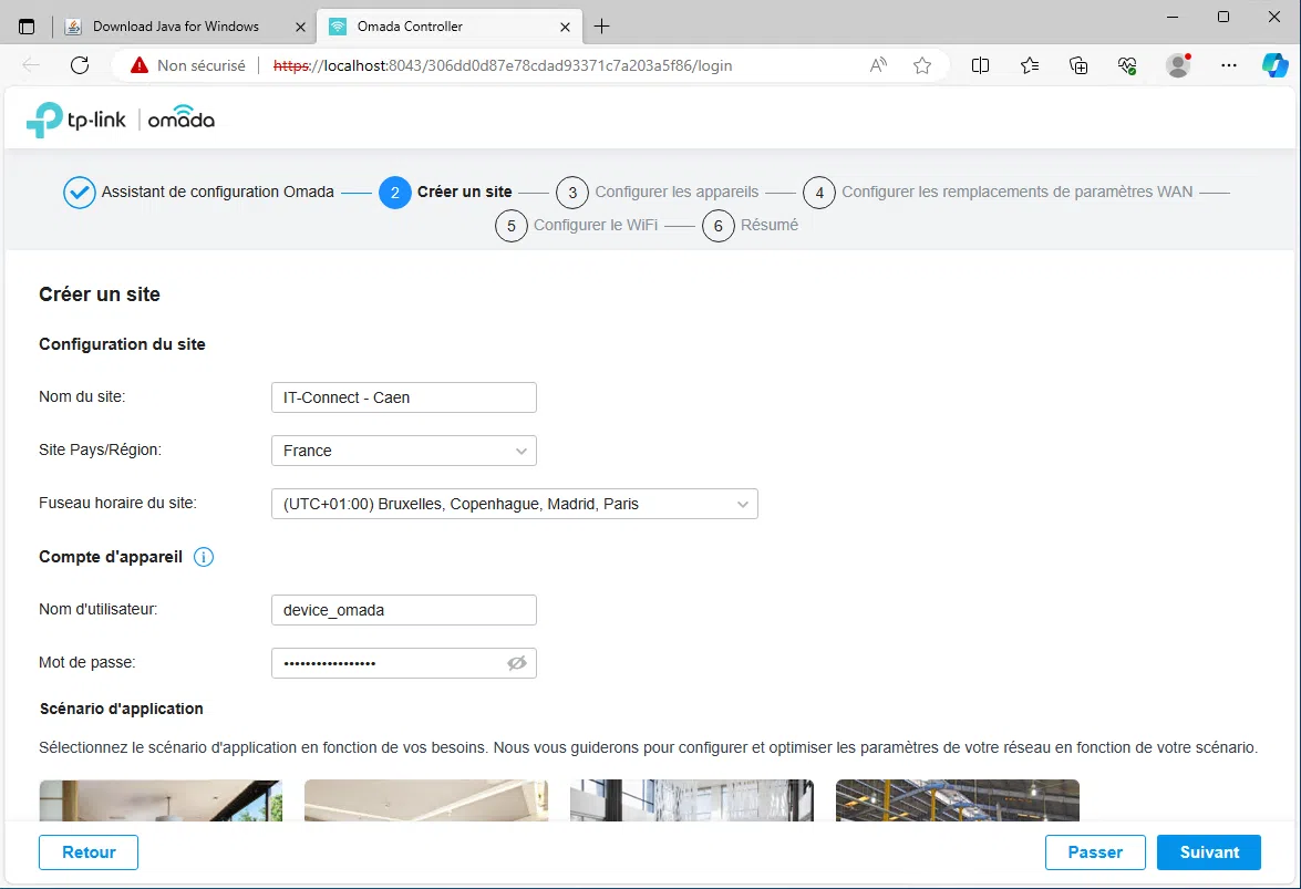 - Créer un premier site (ce qui permettra de lui associer des équipements), définir le nom d'utilisateur et le mot de passe du compte admin qui devra être poussé sur les périphériques de ce site et sélectionner un scénario de déploiement (pour qu'Omada guide l'utilisateur en fonction de ce choix)