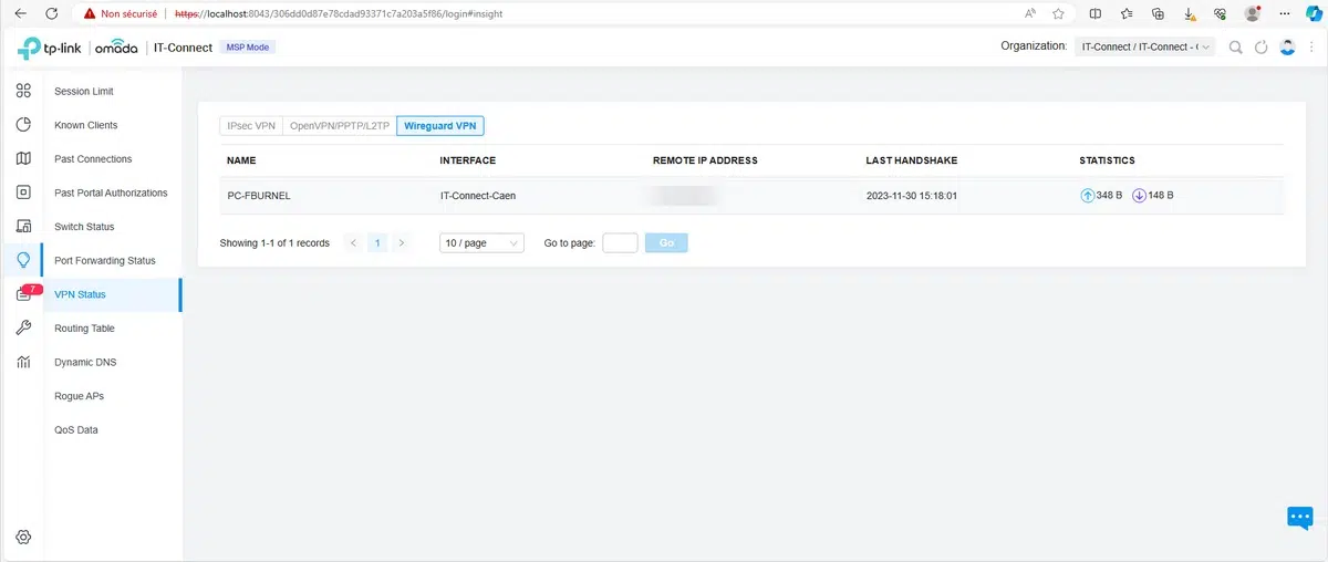 Du côté d'Omada, nous pouvons suivre les connexions VPN à cet endroit : Insights > VPN Status > WireGuard VPN. Nous pouvons voir que le peer "PC-FBURNEL" est connecté et nous avons quelques statistiques sur la quantité de données transférées.
