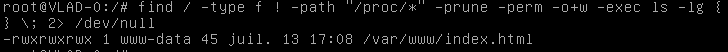 Nous aurons alors en retour tous les fichiers world writable du système et afficher leurs droits, leur propriétaire et leur chemin complet :