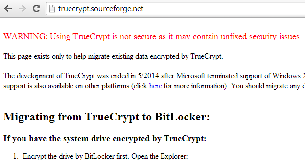 D'ailleurs, ce même BitLocker est recommandé sur cette page pour les utilisateurs de Windows où l'on retrouve un tutoriel sur la configuration de BitLocker : "Migrer de TrueCrypt à BitLocker". Difficile de croire que les développeurs de TrueCrypt abandonneraient le développement de l'application au profit de la solution Microsoft.