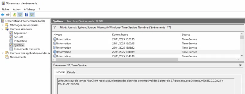 Dans l’Observateur d’événements, à cet endroit : Journaux Windows > Système, puis ajoutez un filtre sur la source "Time-Service".
