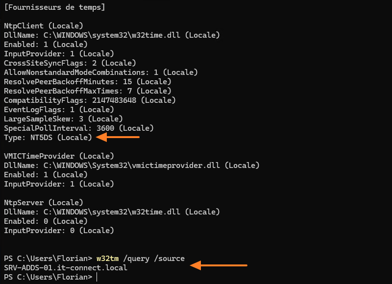 Le fournisseur de temps est de type NT5DS, car la machine se synchronise auprès de la source de temps qui fait autorité sur votre domaine Active Directory. Donc... le serveur avec le rôle d'Emulateur PDC.