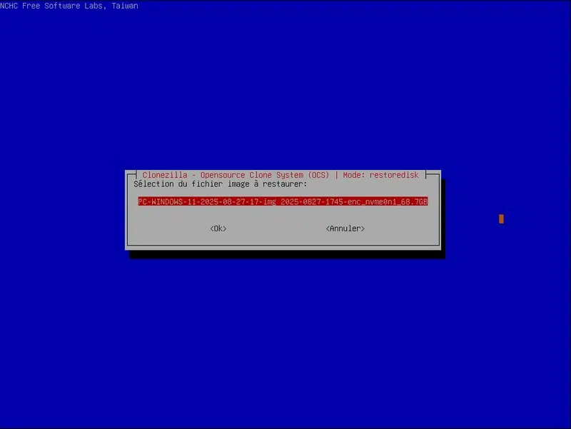 Clonezilla va analyser le disque pour trouver les images disponibles. Ici, nous avons bien une image disponible.