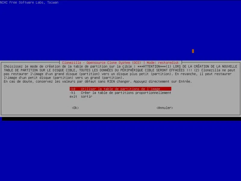 Vous devez indiquer à Clonezilla s'il faut conserver la table de partitions de l'image (mêmes partitions, mêmes tailles) ou si vous souhaitez que ce soit adapté à la taille du nouveau disque. Autrement dit, si le disque est plus grand, les partitions seront agrandies automatiquement.