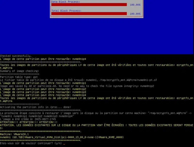 Pour finir, Clonezilla vous demandera de confirmer que vous souhaitez écraser le disque cible avec les données de l'image. Vous devez confirmer avec y puis Entrée (deux fois).
