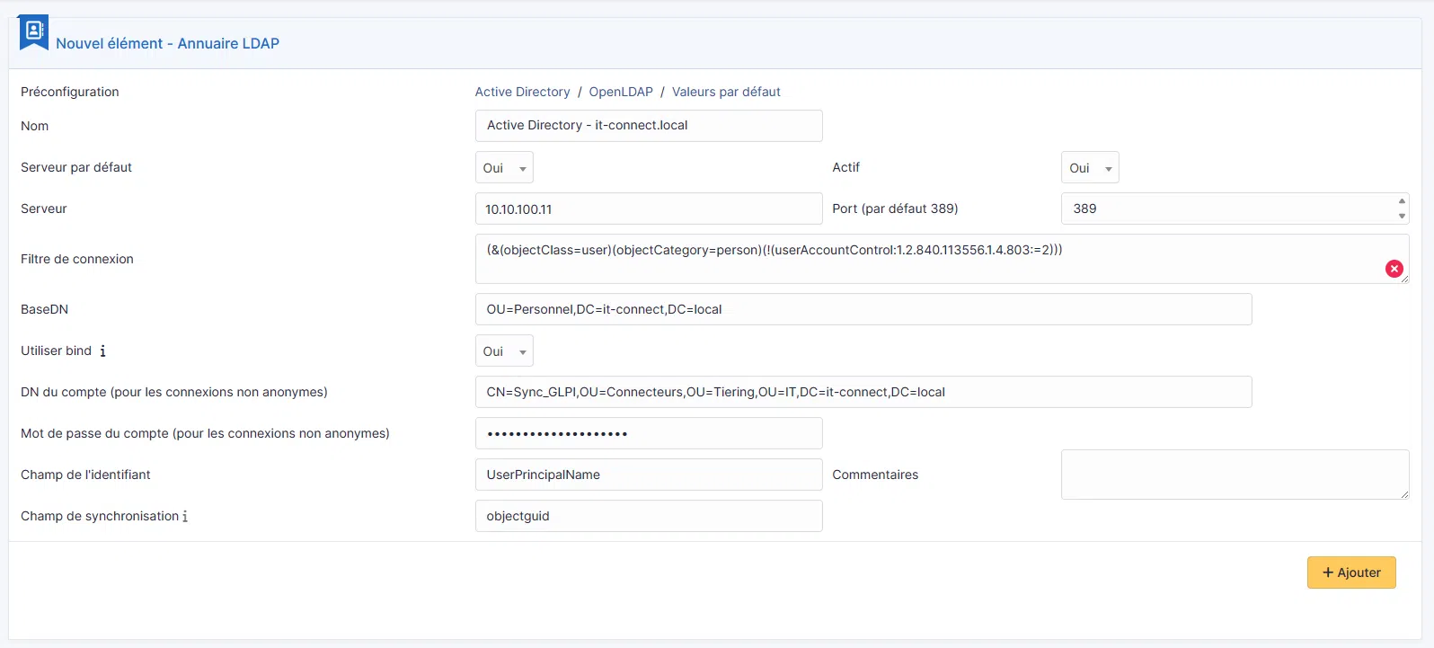 - DN du compte : CN=Sync_GLPI,OU=Connecteurs,OU=Tiering,OU=IT,DC=it-connect,DC=local