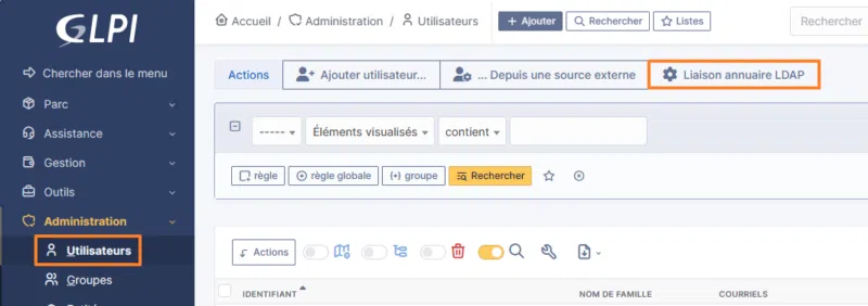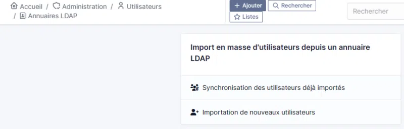 Cliquez sur "Administration" dans le menu, puis "Utilisateurs". Ici, vous avez accès au bouton "Liaison annuaire LDAP".